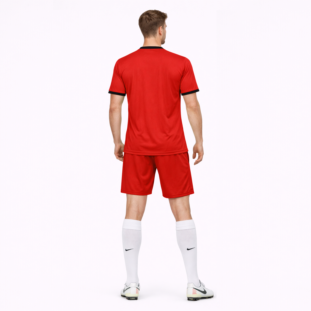 Premium Canada-inspired football jersey set featuring a bold red jersey and matching red nikker, representing Canada’s strong national identity. The design includes a black V-neck collar, contrast sleeve cuffs, and a clean plain back for a sharp, professional finish.