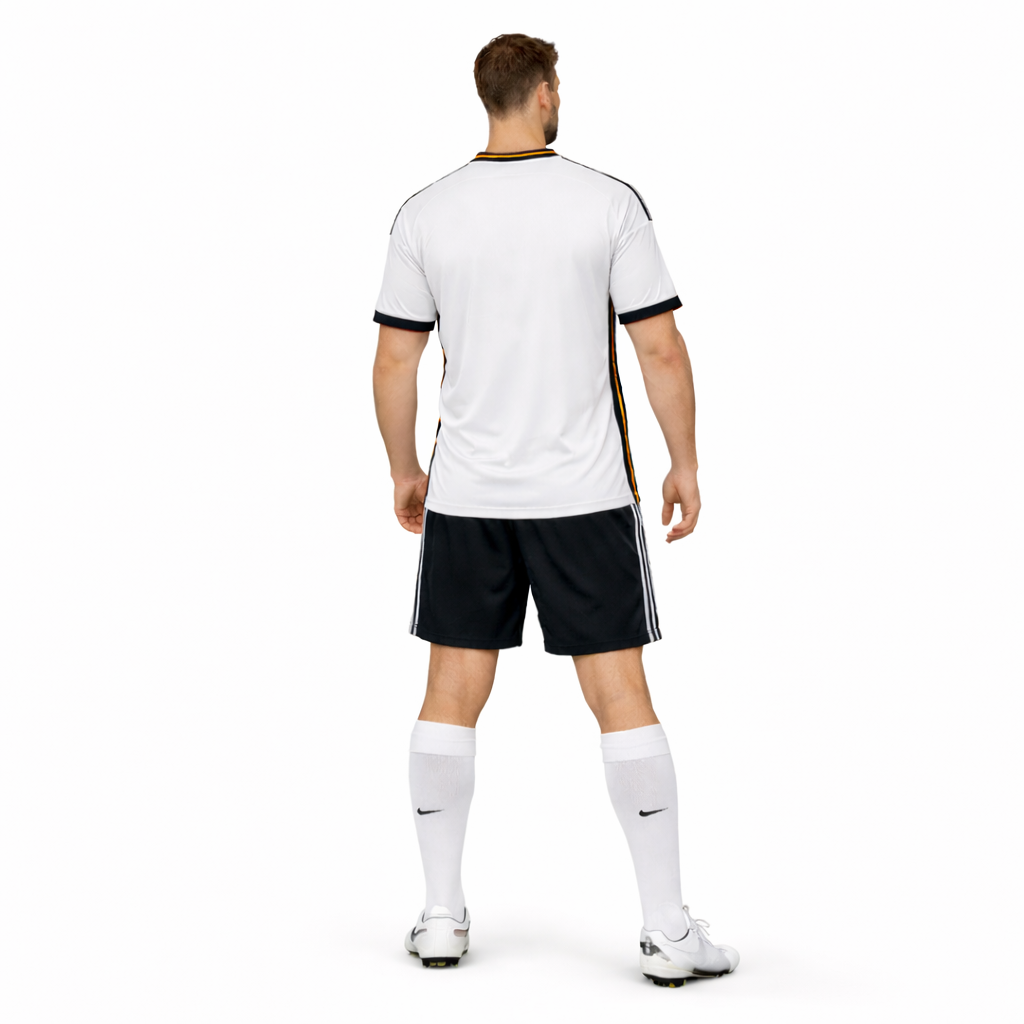 Premium Germany-inspired football jersey set featuring a classic white jersey with a bold black vertical center panel, reflecting Germany’s strong and iconic football identity. The design includes black sleeve cuffs, subtle shoulder stripe detailing, and a clean plain back for a modern, professional look.