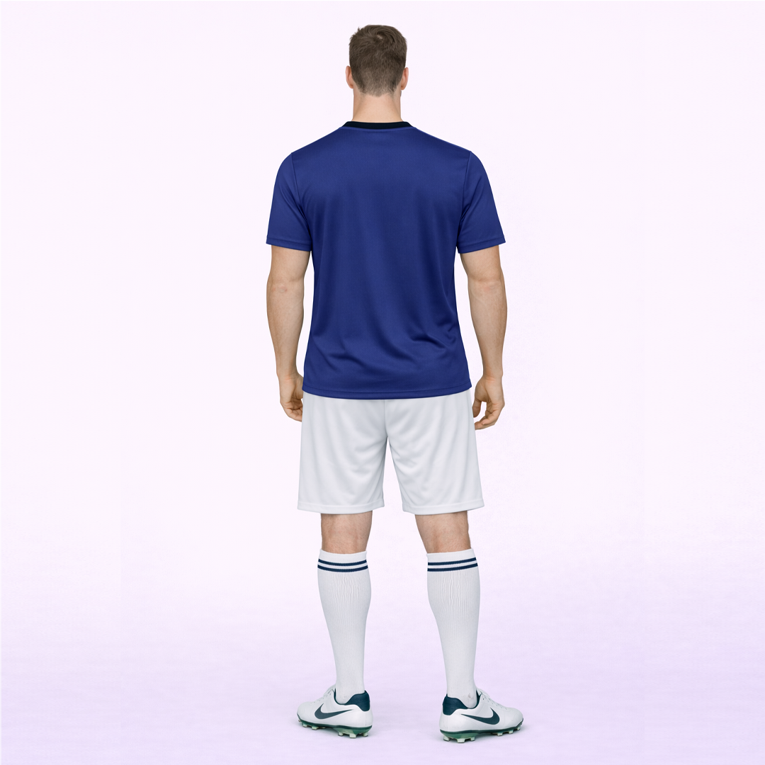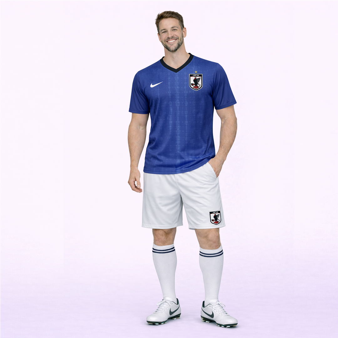 This Japan-inspired football jersey set features a clean and modern royal blue jersey paired with a crisp white nikker, creating a sharp and balanced national look. The jersey is designed with a black V-neck collar, adding contrast and a professional finish.