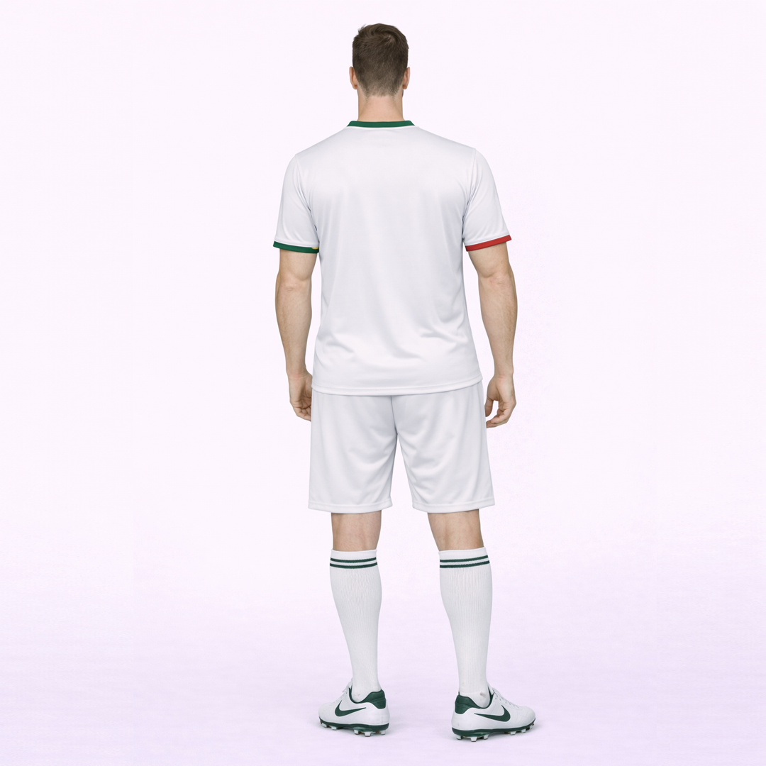 The sleeve cuffs are asymmetrically detailed—green on one side and red on the other—giving the design a subtle but distinctive national touch. The front remains clean and uncluttered, while the plain white back is ideal for player name and number customization. The nikker follows a matching white design for a balanced and unified appearance.