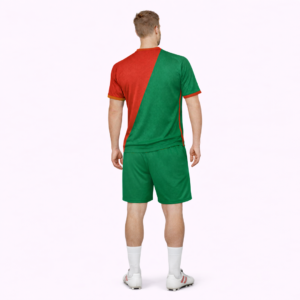 This Portugal-inspired football jersey set showcases a bold and modern design built around Portugal’s iconic red and green colors. The jersey features a striking diagonal split pattern, with rich red on one side and deep green on the other, creating a powerful and dynamic national look.
