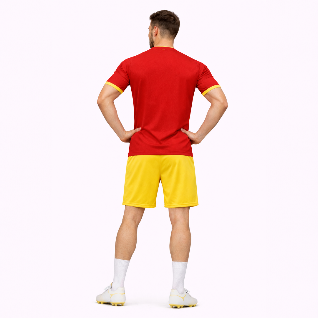 This Spain-inspired football jersey set reflects the passion, energy, and winning spirit of Spanish football. The jersey comes in a bold red base, symbolizing strength and confidence, paired with a bright yellow nikker that completes Spain’s iconic national color combination.